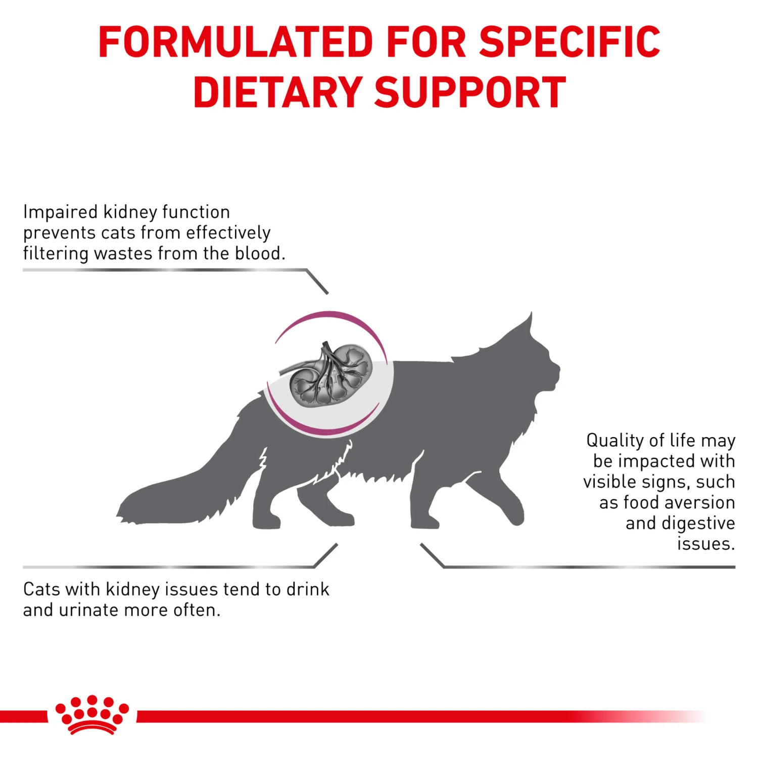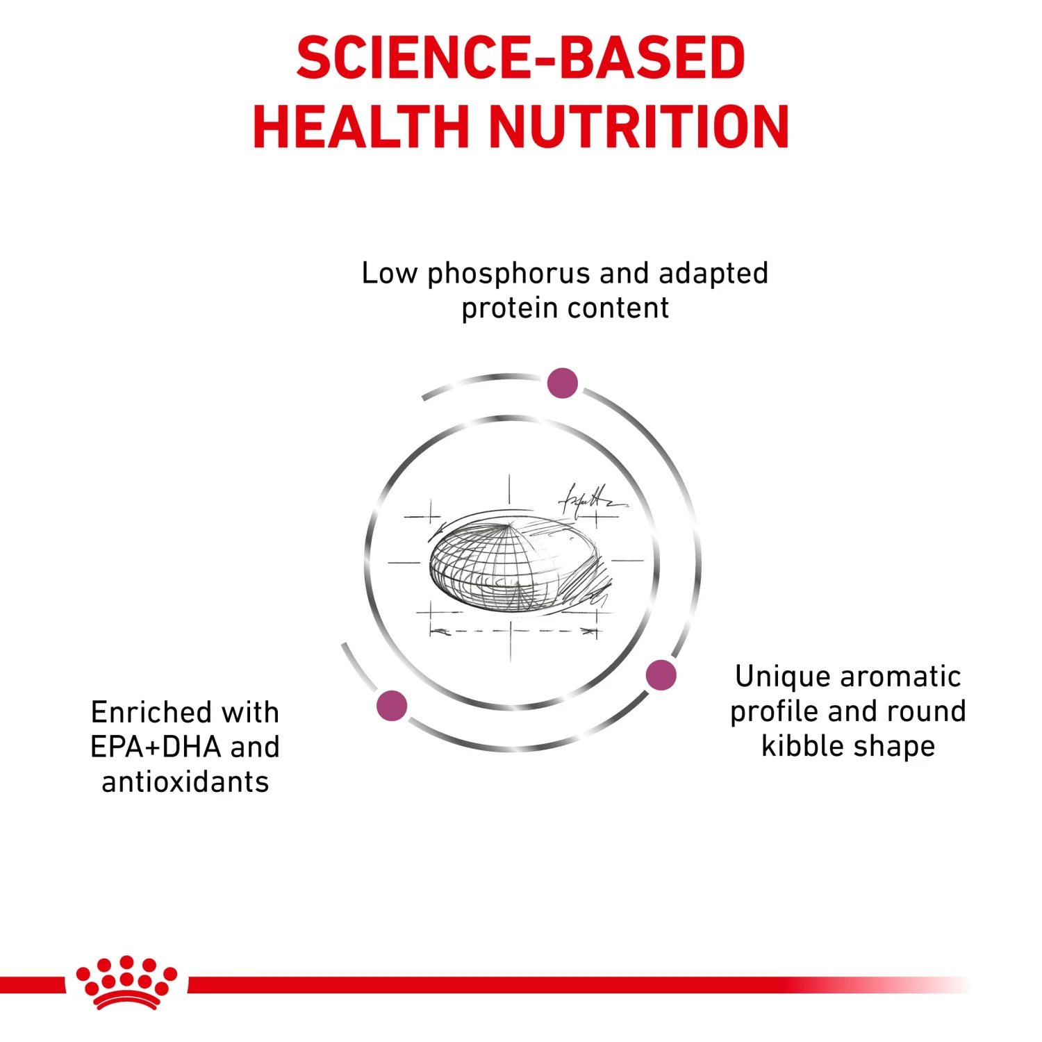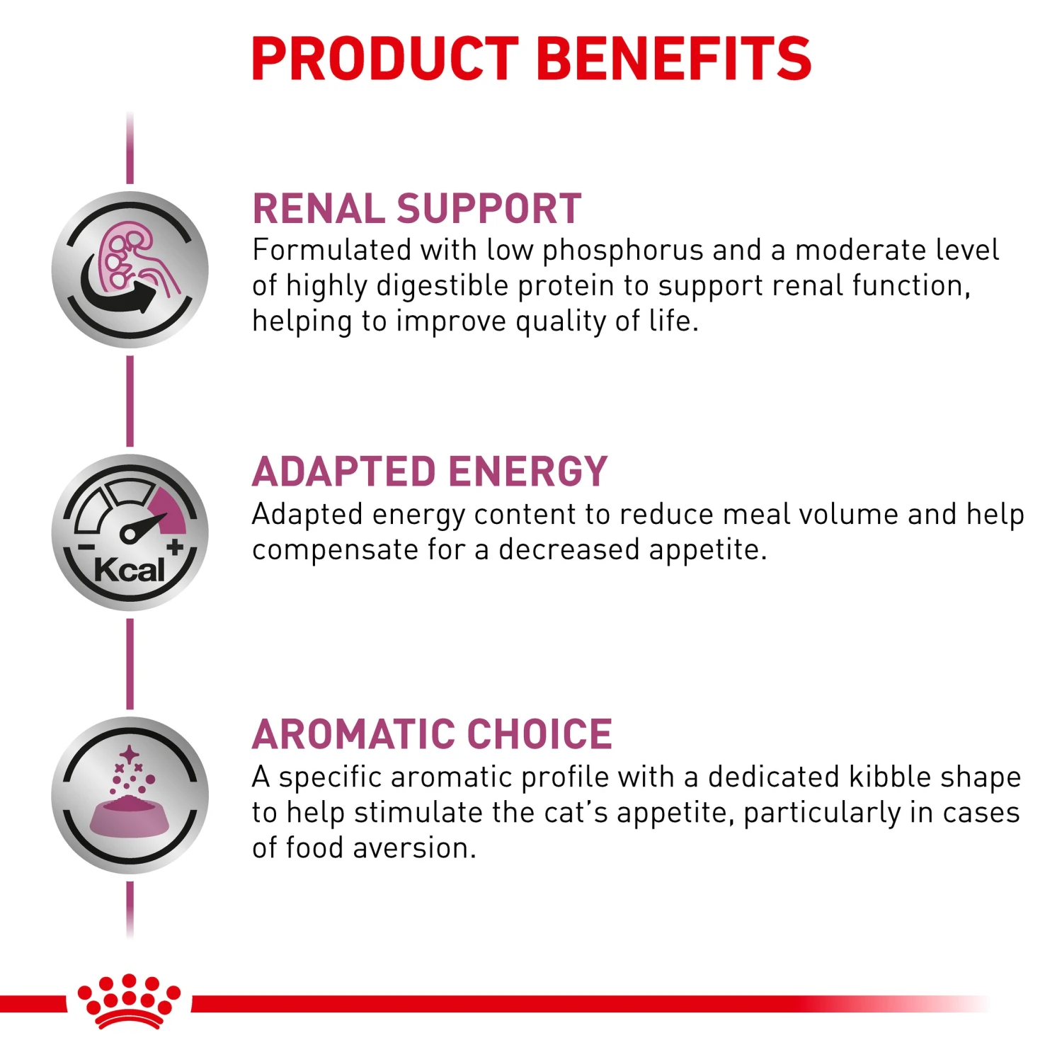 Royal Canin¨ Renal dry cat food is a complete dietetic feed for cats formulated to support renal function in the case of chronic renal insufficiency, through its restricted levels of phosphorus and high-quality proteins. Scientifically formulated to support renal function in cases of chronic kidney disease.Renal dry is also formulated to reduce oxalate stone formation through its low level of calcium and Vitamin D, and its urine alkalising properties.