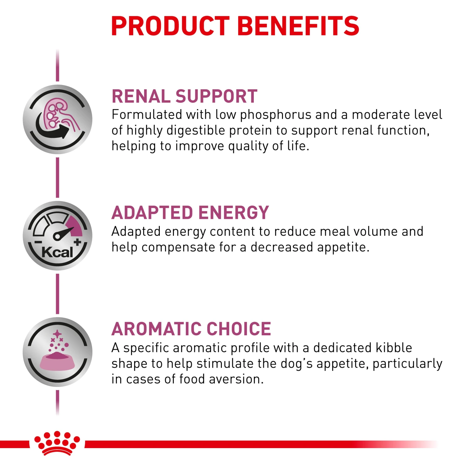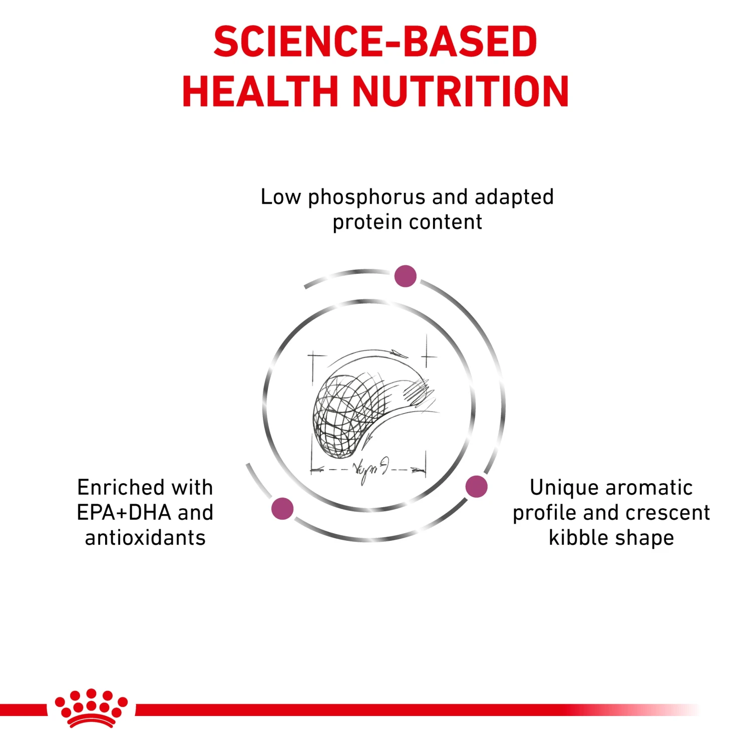 Royal Canin Renal Select is scientifically formulated to support renal function in cases of chronic kidney disease. Formulated with low phosphorus and a moderate level of highly digestible protein to support renal function, helping to improve quality of life. With an adapted energy content to reduce meal volume and help compensate for a decreased appetite. And a specific aromatic profile with a dedicated kibble shape to help stimulate the dog’s appetite, particularly in cases of food aversion.