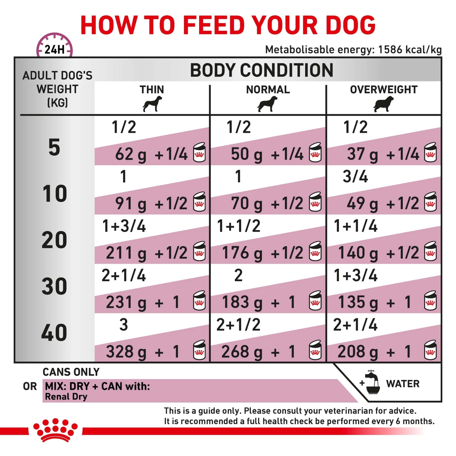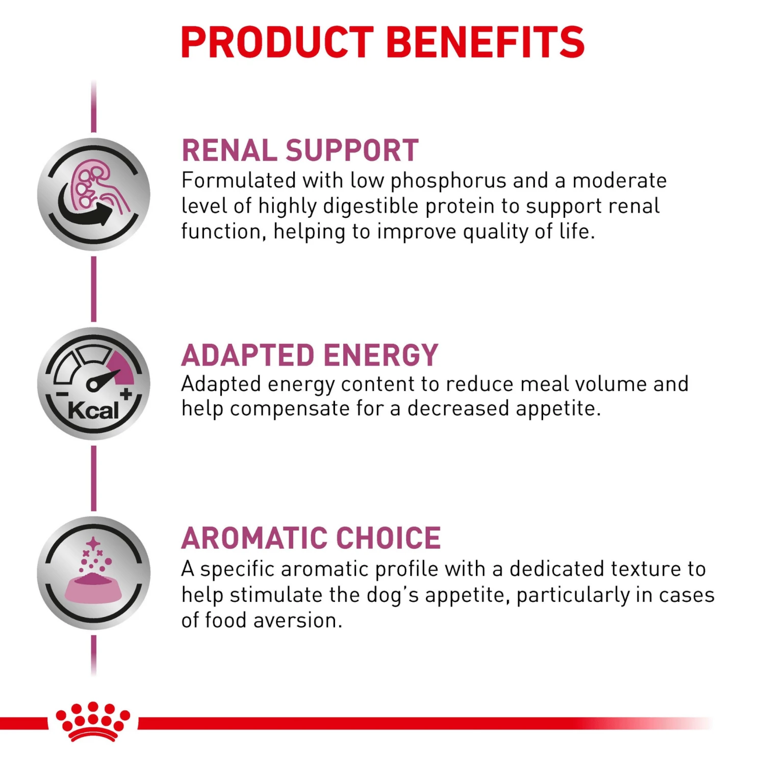 Royal Canin Renal is scientifically formulated to support renal function in cases of chronic kidney disease. Renal diets are recommended as soon as creatinine goes out of reference range (from CKD late stage 2), before the disease further progresses, and before inappetence develops. In case of food aversion, the dog can be switched to another renal option without transition. Renal diets may be continued for the dogs lifetime. It is recommended that a full health check be performed every 6 months.
