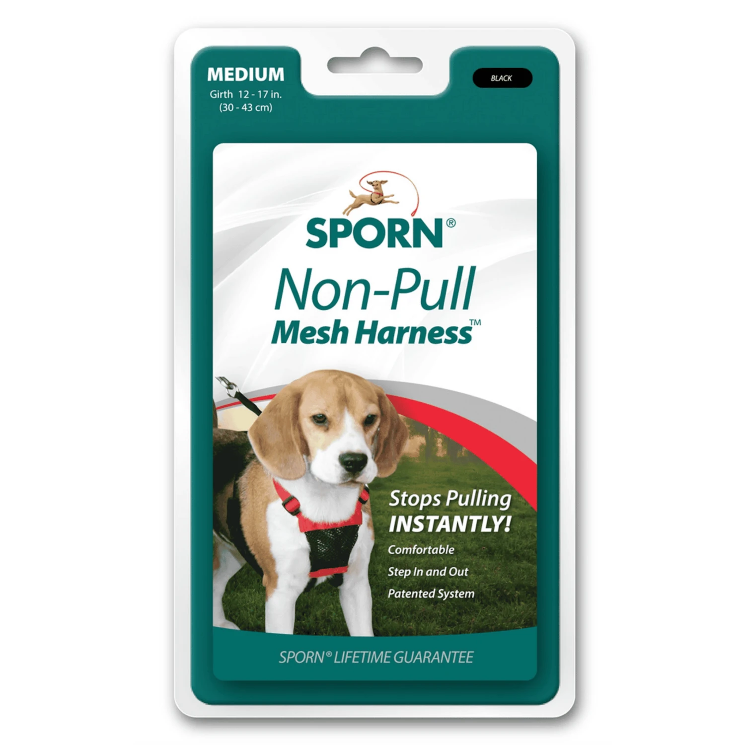The Sporn Non-Pull Mesh Dog Harness fits like a glove and is designed to curb moderate to heavy leash pullers. Made for style, comfort and control, this harness features an elasticized mesh chest piece that moves with your dog. It’s designed to humanely control any size dog without choking, and the one-piece harness is easy to put on and take off. The padded restraint sleeves offer extra comfort under the front legs.