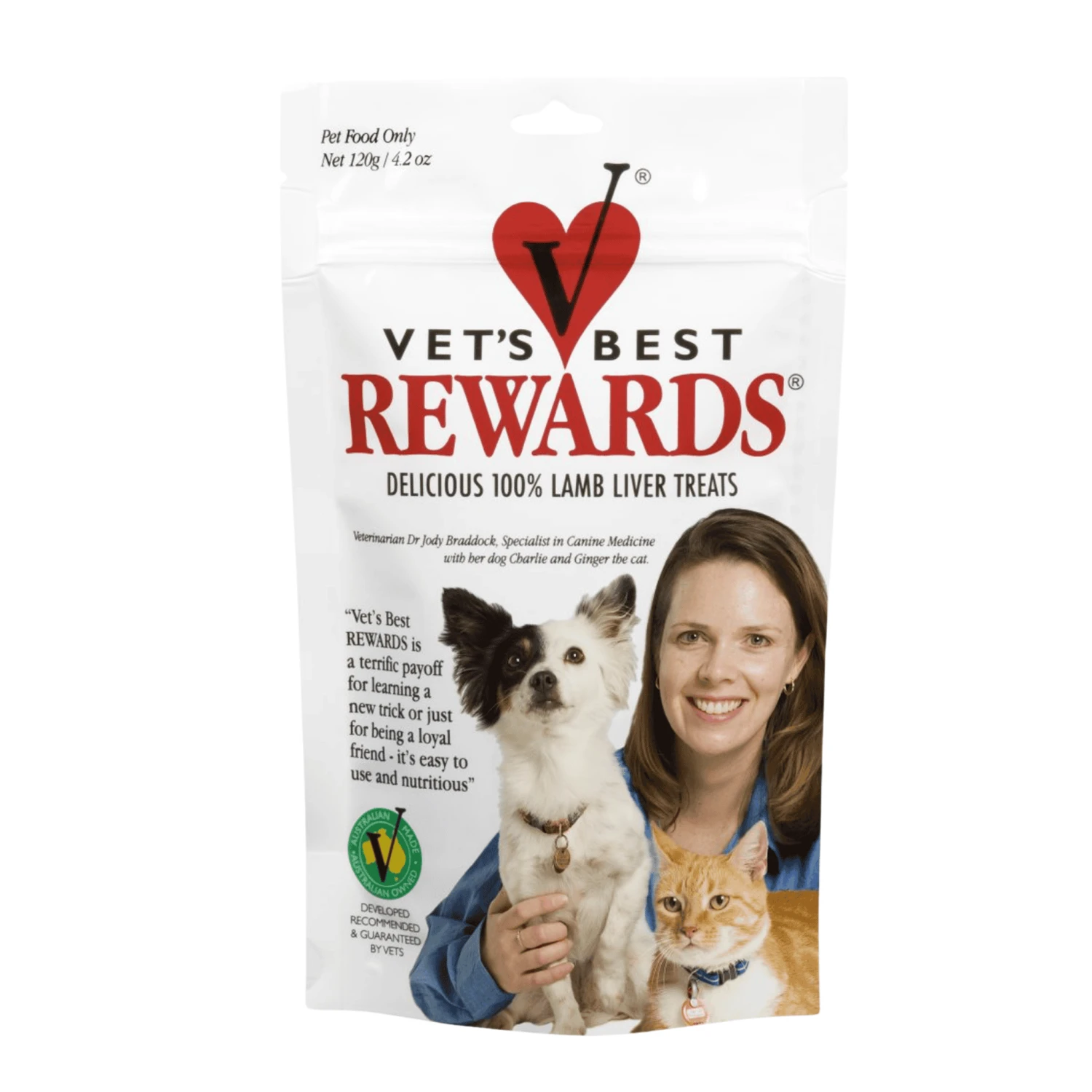 Vet’s Best Rewards are made only from certified human grade Australian lamb/sheep liver and contain no additives or preservatives. Oven-baked to perfection with that irresistible taste of real liver and high in quality protein and B group vitamins, these tasty yet healthy treats can be given to your pet dog or cat as a training aid, show-ring aid or simply as a reward for good behaviour.