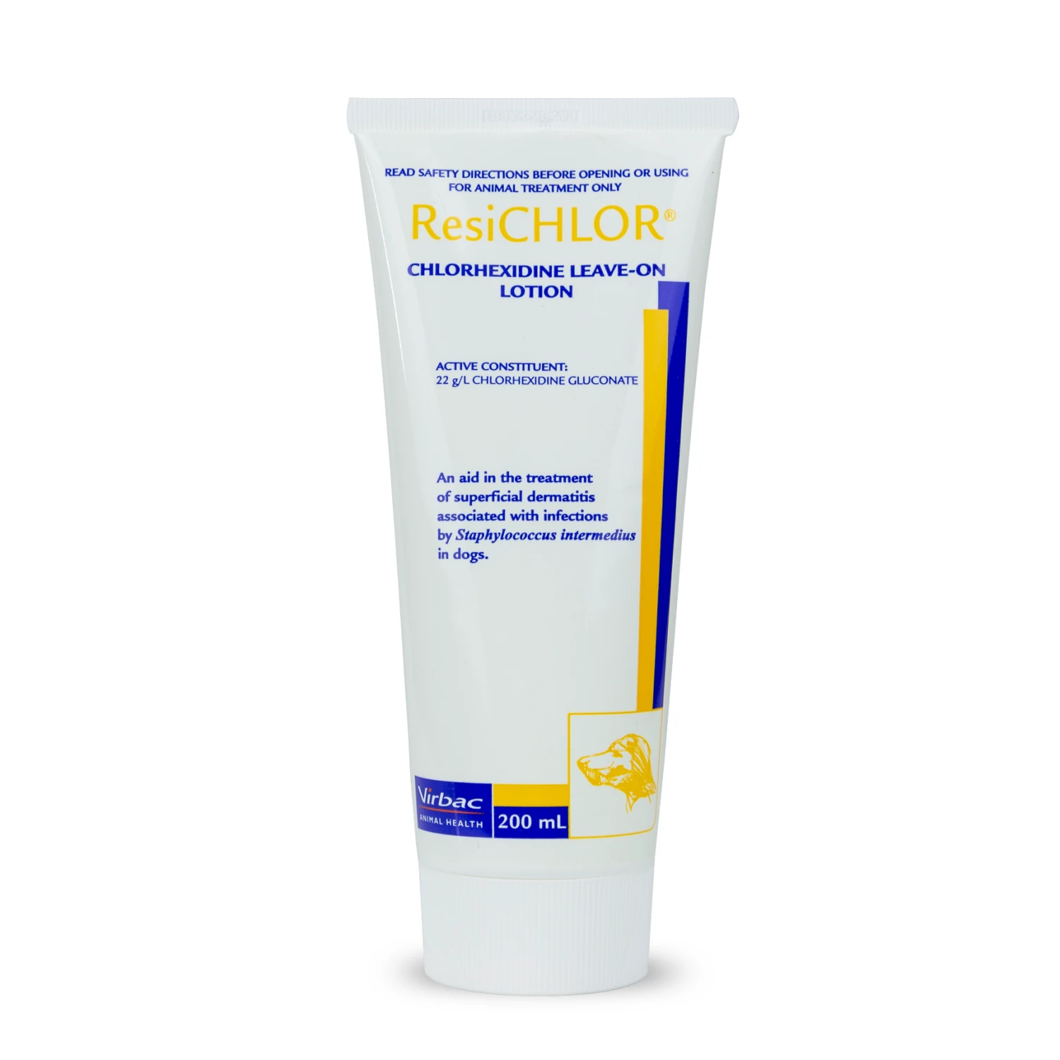 Resichlor Chlorhexidine Leave-On Lotion is designed to aid in the treatment of superficial dermatitis associated with Staphylococcus intermedius in dogs. With an active ingredient concentration of 22g/L Chlorhexidine gluconate, this lotion provides effective support for treating pyoderma between baths.