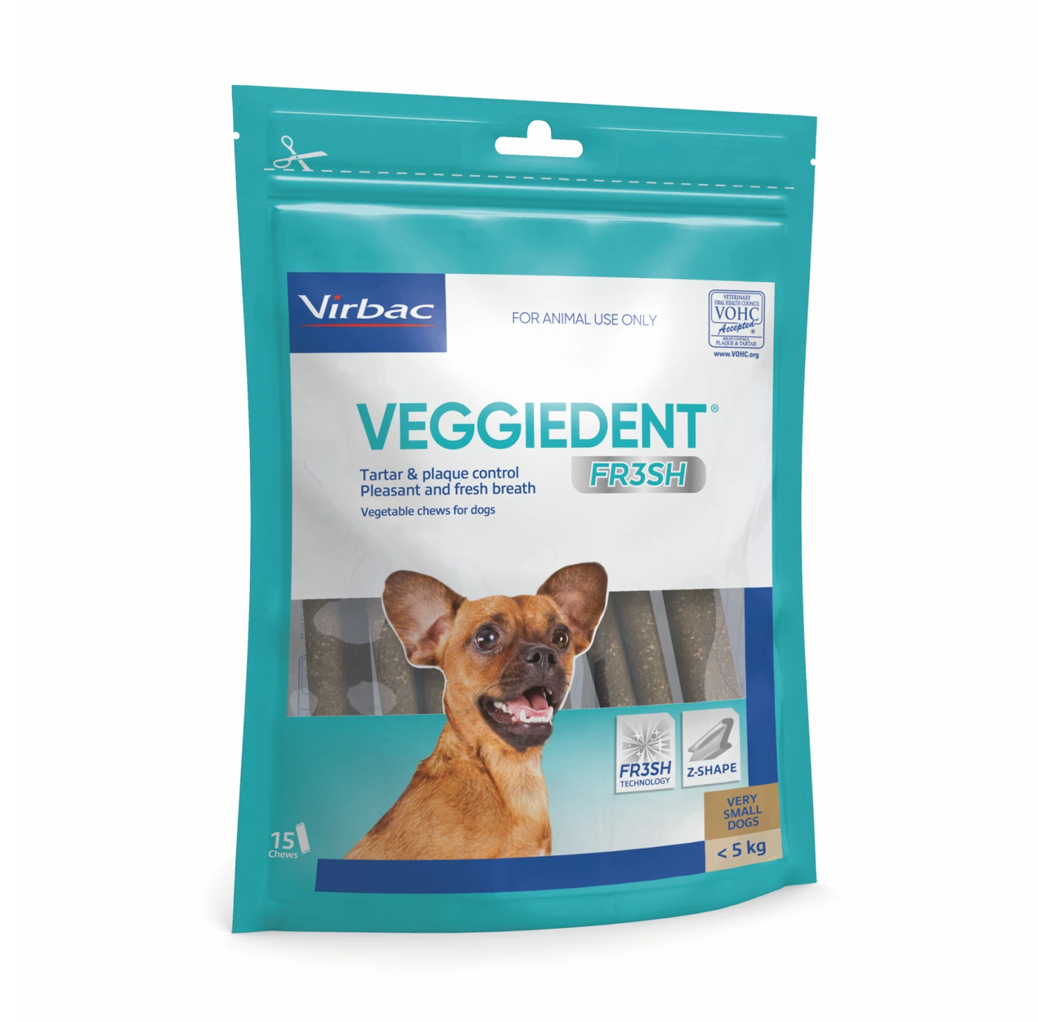 VeggieDent® FR3SH dental chews feature the innovative Z-shape that makes it easy for your dog to grab and chew. This shape, along with the size and texture, helps to reduce plaque and tartar formation, enhancing teeth cleaning, as accepted by the Veterinary Health Care Council (VOHC®).