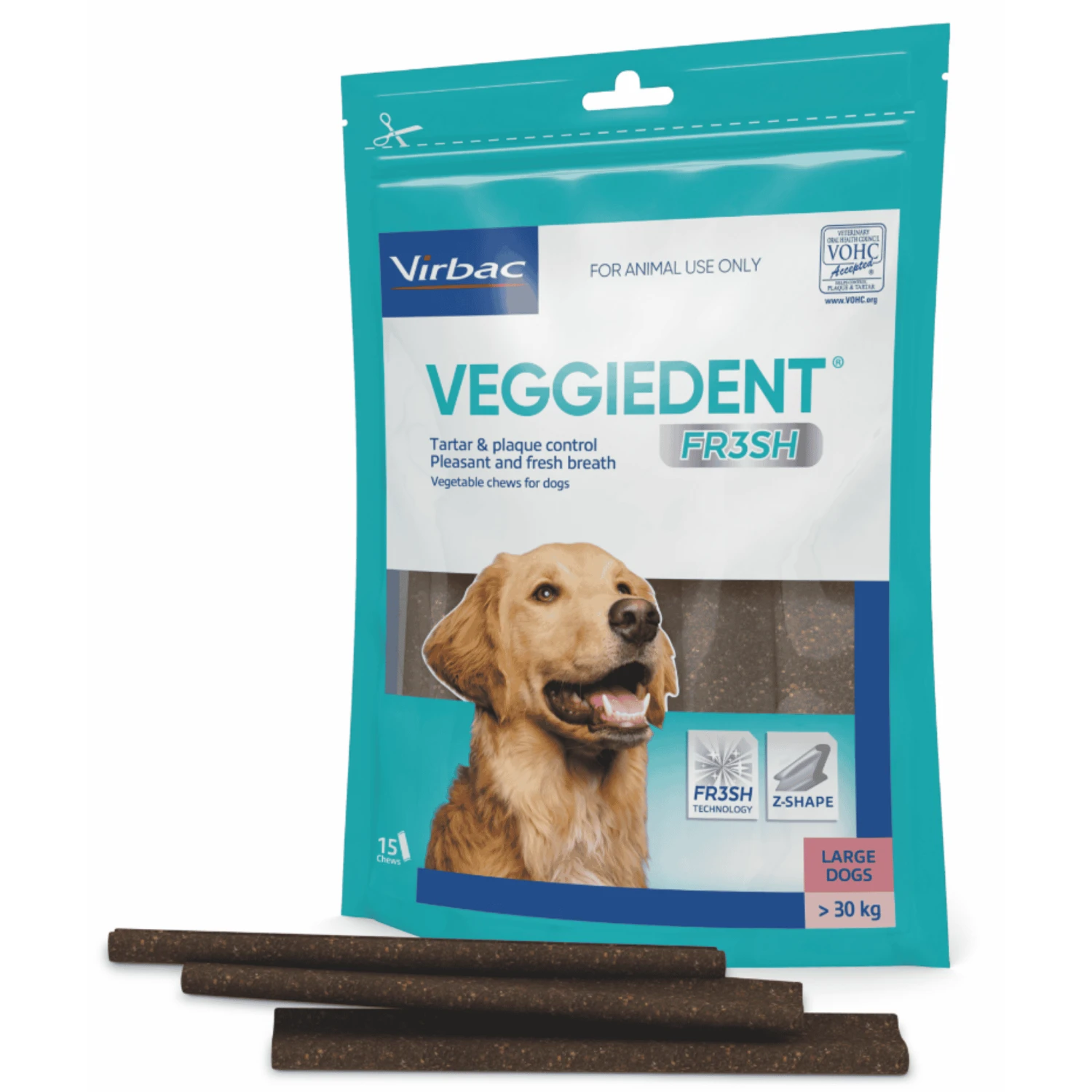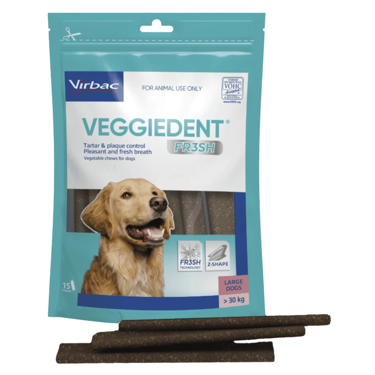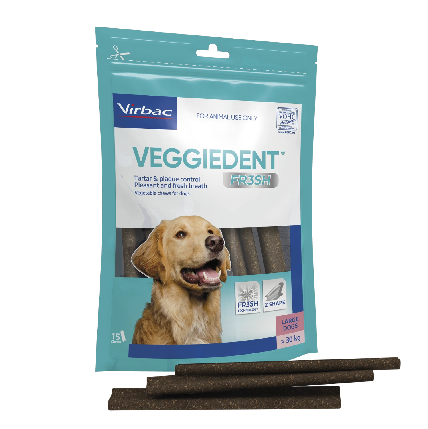 VeggieDent® FR3SH dental chews feature an innovative Z-shape design, making them easy for your dog to grab and chew. This unique shape, combined with the right size and texture, effectively reduces plaque and tartar formation, promoting dental health as recognised by the Veterinary Health Care Council (VOHC®).