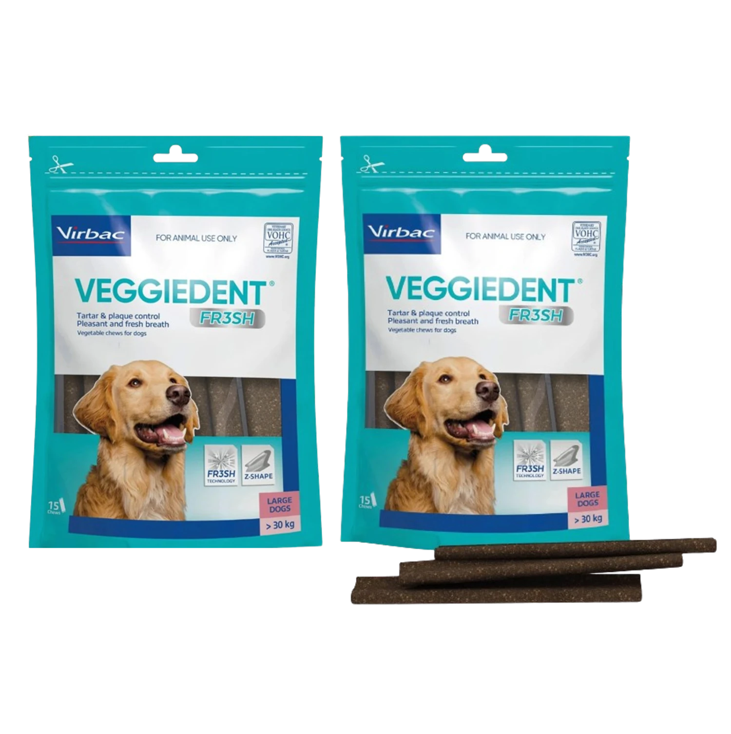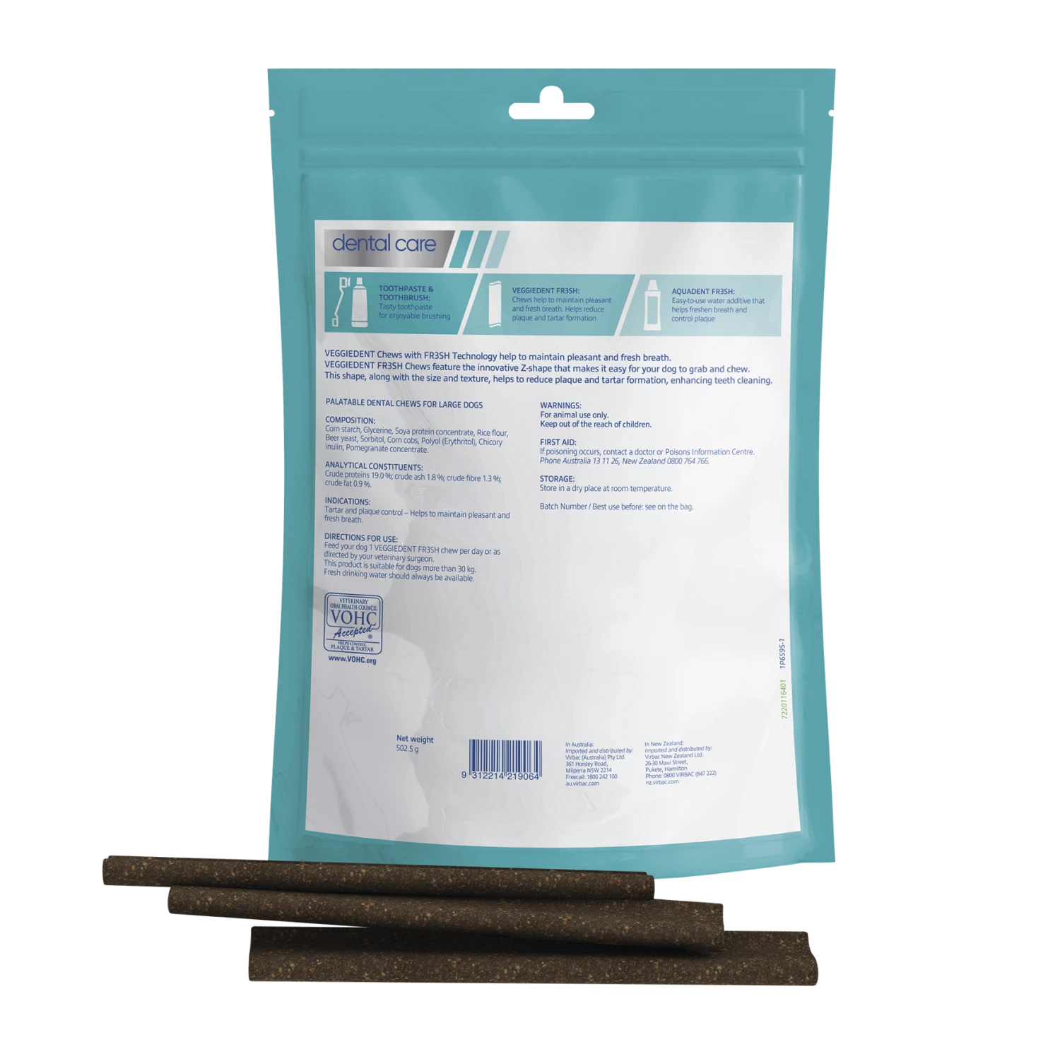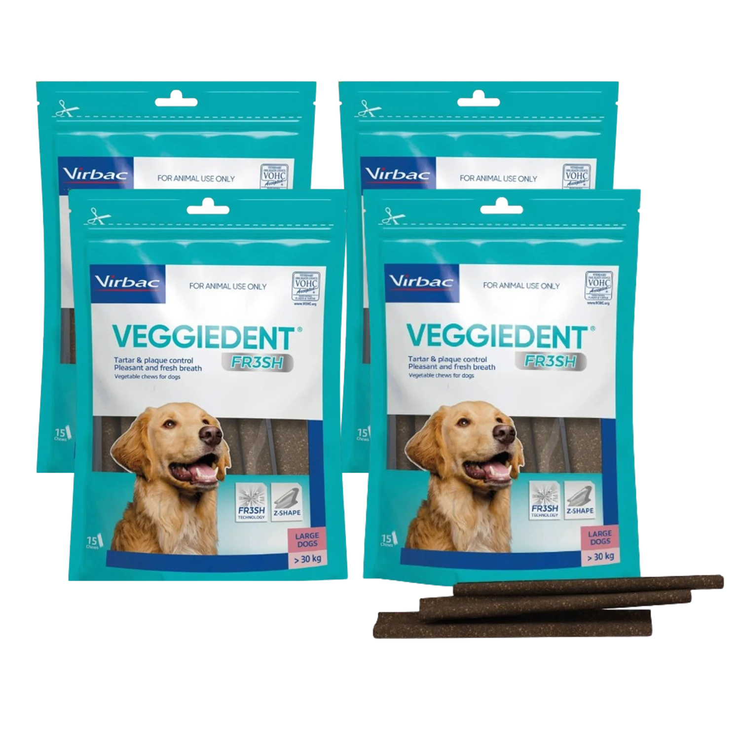 VeggieDent® FR3SH dental chews feature an innovative Z-shape design, making them easy for your dog to grab and chew. This unique shape, combined with the right size and texture, effectively reduces plaque and tartar formation, promoting dental health as recognised by the Veterinary Health Care Council (VOHC®).
